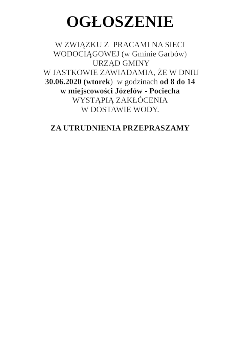 ZAKŁÓCENIA W DOSTAWIE WODY - JÓZEFÓW POCIECHA