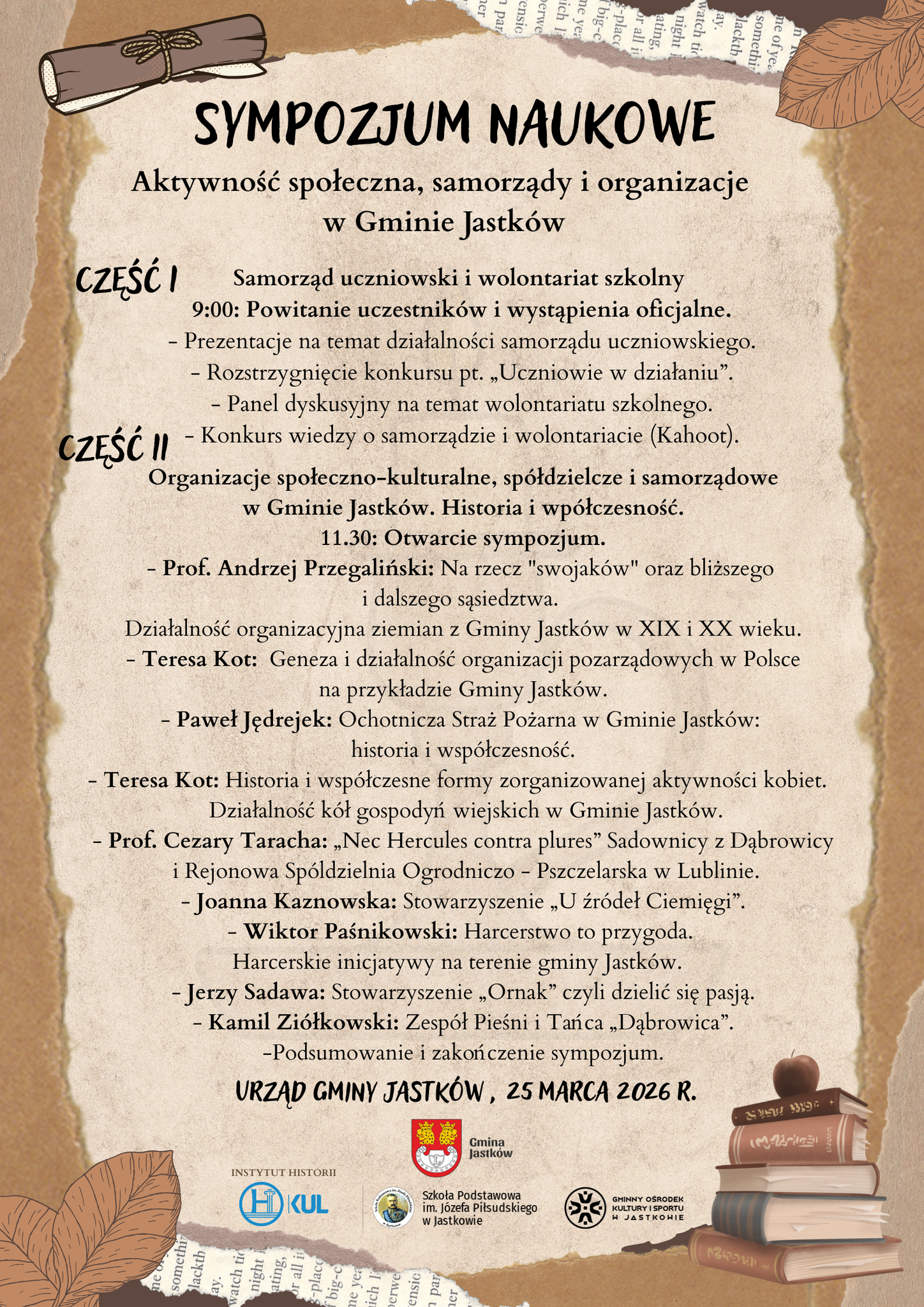 Serdecznie zapraszamy do udziału w Sympozjum Naukowym pt. „Aktywność społeczna, samorządy i organizacje w Gminie Jastków”, które odbędzie się 25 marca 2026 roku w Urzędzie Gminy Jastków.