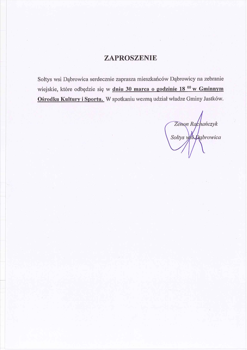 Sołtys wsi Dąbrowica serdecznie zaprasza mieszkańców Dąbrowicy na zebranie wiejskie, które odbędzie się w dniu 30 marca o godzinie 18 00 w Gminnym Ośrodku Kultury i Sportu.W spotkaniu wezmą udział władze Gminy Jastków.