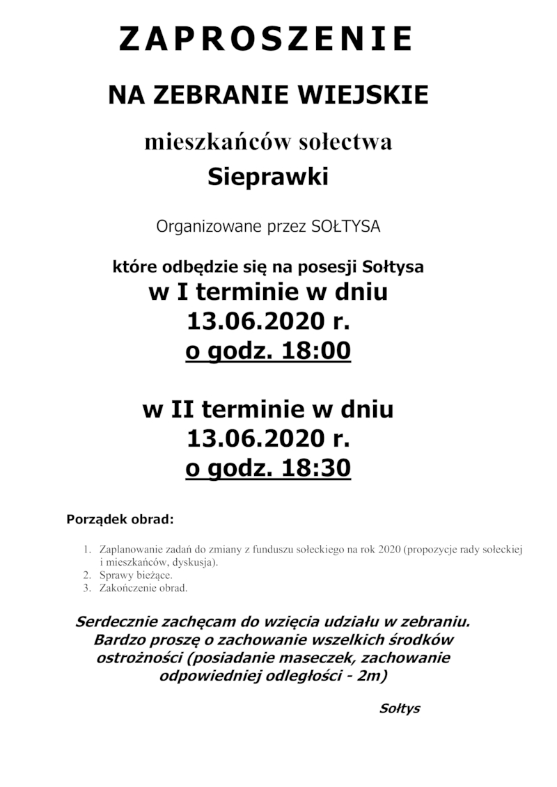 ZAPROSZENIE NA ZEBRANIE WIEJSKIE