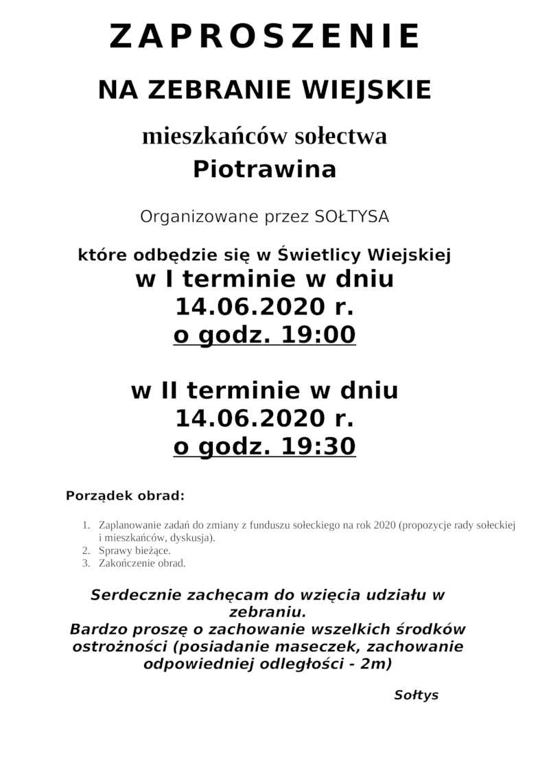ZAPROSZENIE NA ZEBRANIE WIEJSKIE PIOTRAWIN