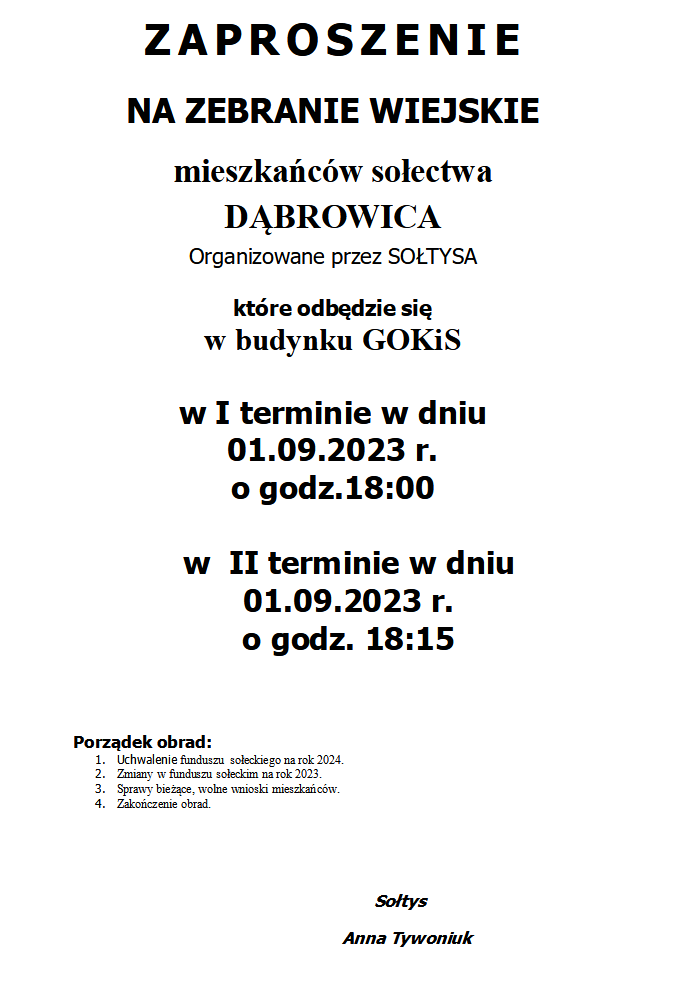 ZAPROSZENIE NA ZEBRANIE WIEJSKIE MIESZKAŃCÓW SOŁECTWA DĄBROWICA ORGANIZOWANE PRZEZ SOŁTYSA