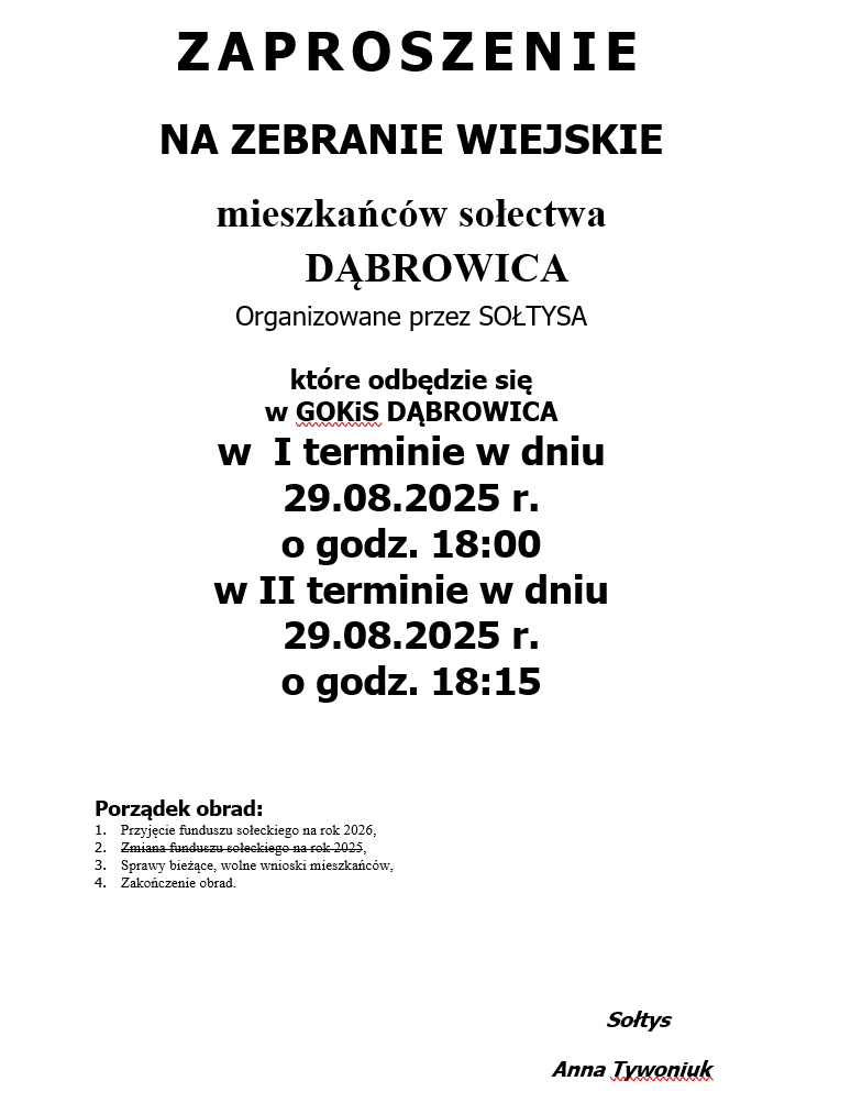 ZAPROSZENIE NA ZEBRANIE WIEJSKIE MIESZKAŃCÓW SOŁECTWA DĄBROWICA ORGANIZOWANE PRZEZ SOŁTYSA