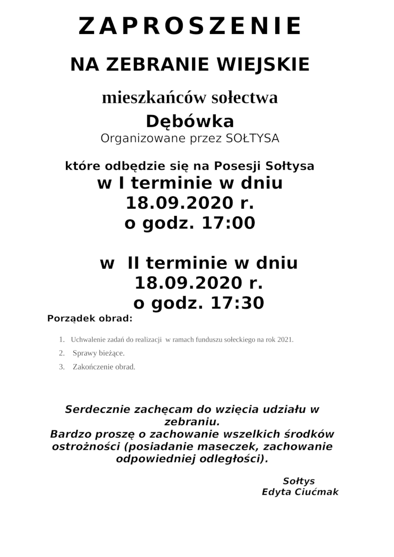 ZAPROSZENIE NA ZEBRANIE WIEJSKIE MIESZKAŃCÓW SOŁECTWA DĘBÓWKA