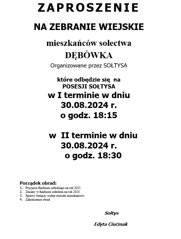 ZAPROSZENIE NA ZEBRANIE WIEJSKIE MIESZKAŃCÓW SOŁECTWA DĘBÓWKA ORGANIZOWANE PRZEZ SOŁTYSA