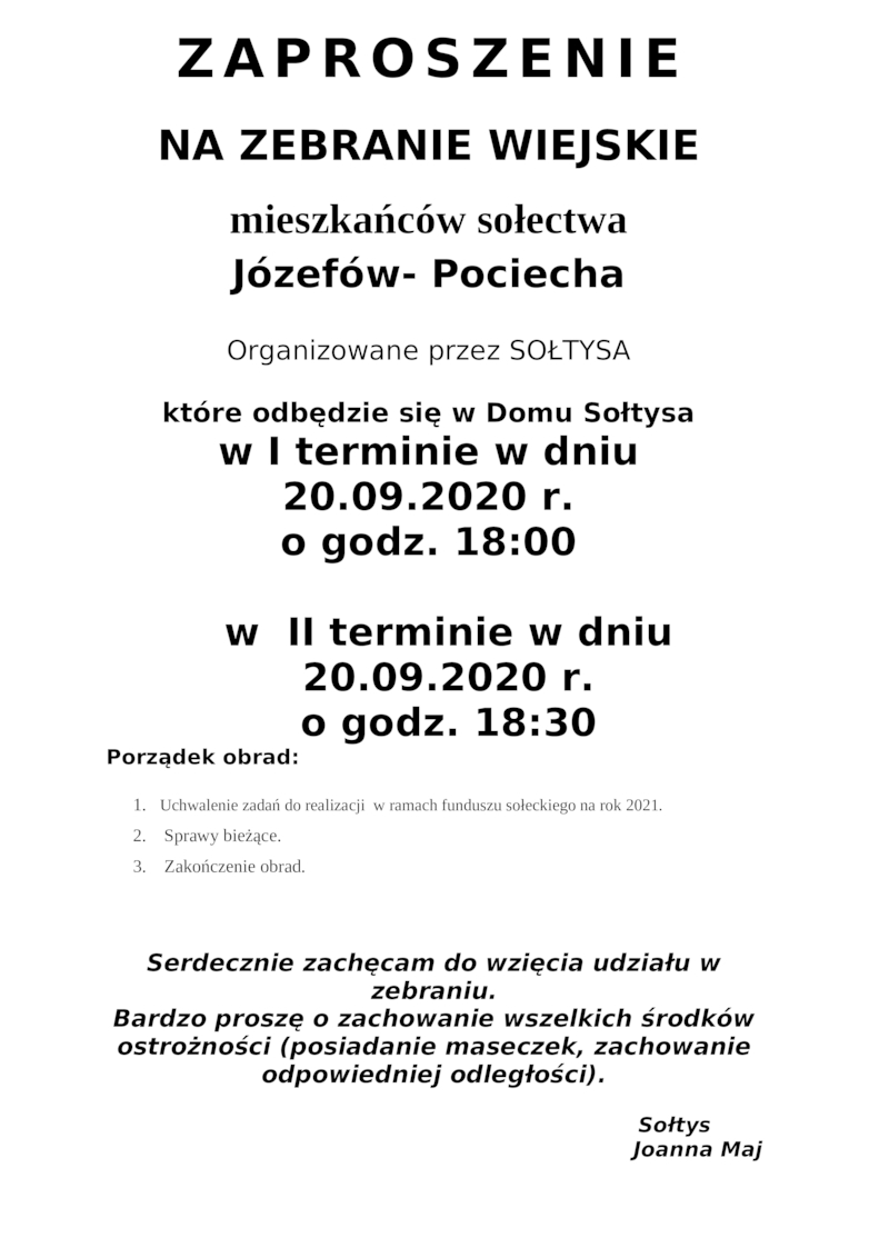 ZAPROSZENIE NA ZEBRANIE WIEJSKIE MIESZKAŃCÓW SOŁECTWA JÓZEFÓW-POCIECHA