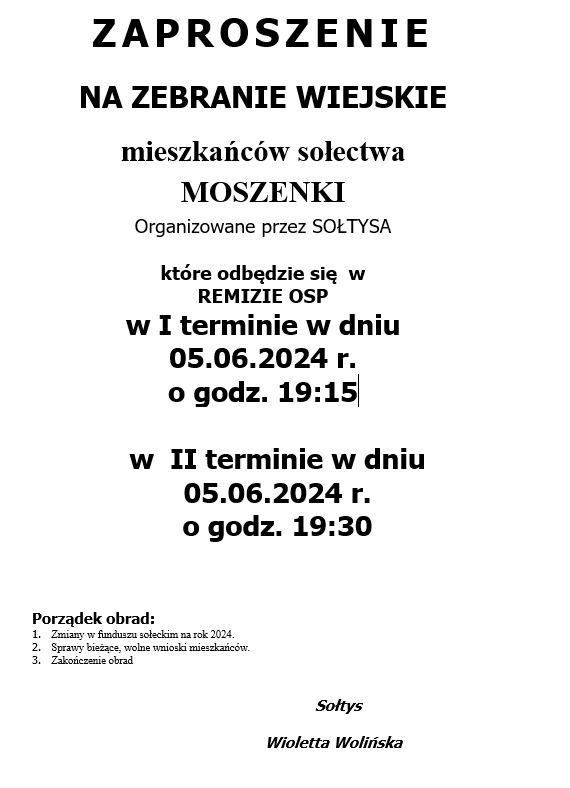 ZAPROSZENIE NA ZEBRANIE WIEJSKIE MIESZKAŃCÓW SOŁECTWA MOSZENKI