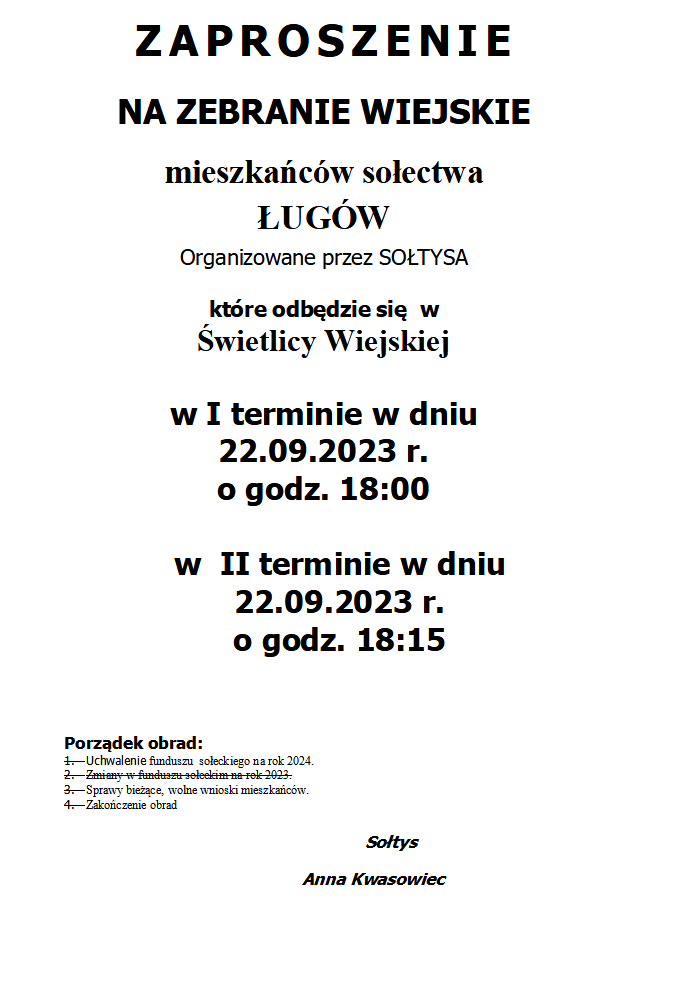 ZAPROSZENIE NA ZEBRANIE WIEJSKIE MIESZKAŃCÓW SOŁECTWA ŁUGÓW ORGANIZOWANE PRZEZ SOŁTYSA