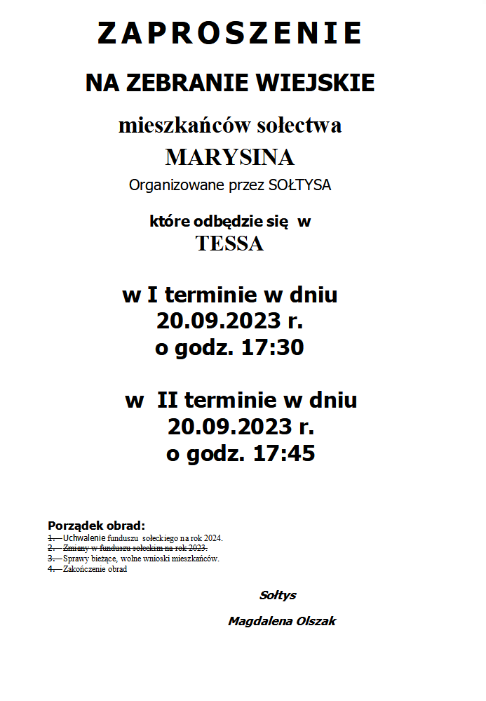 ZAPROSZENIE NA ZEBRANIE WIEJSKIE MIESZKAŃCÓW SOŁECTWA MARYSINA