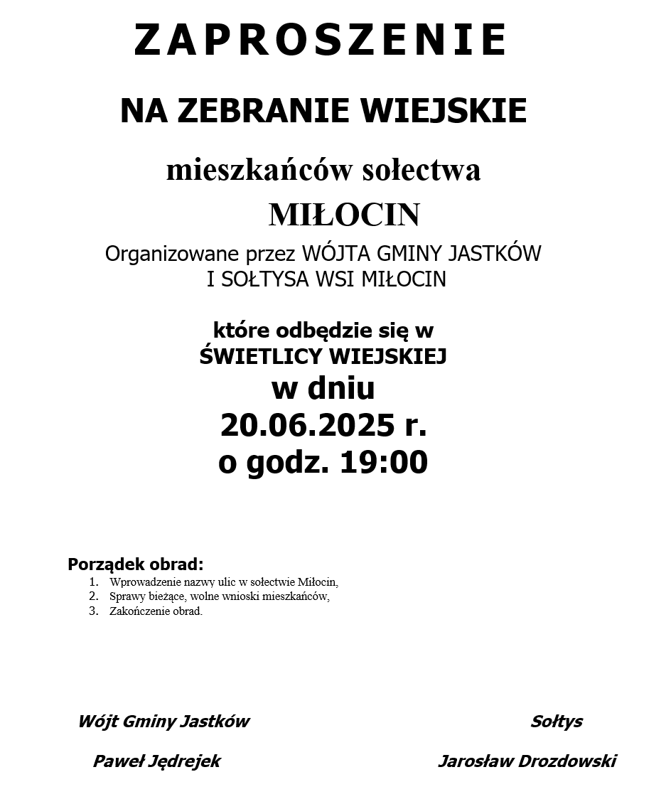 ZAPROSZENIE NA ZEBRANIE WIEJSKIE MIESZKAŃCÓW SOŁECTWA MIŁOCIN