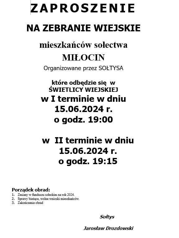 ZAPROSZENIE NA ZEBRANIE WIEJSKIE MIESZKAŃCÓW SOŁECTWA MIŁOCIN ORGANIZOWANE PRZEZ SOŁTYSA