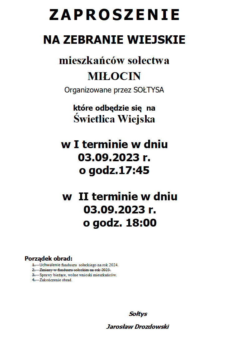 ZAPROSZENIE NA ZEBRANIE WIEJSKIE MIESZKAŃCÓW SOŁECTWA MIŁOCIN ORGANIZOWANE PRZEZ SOŁTYSA