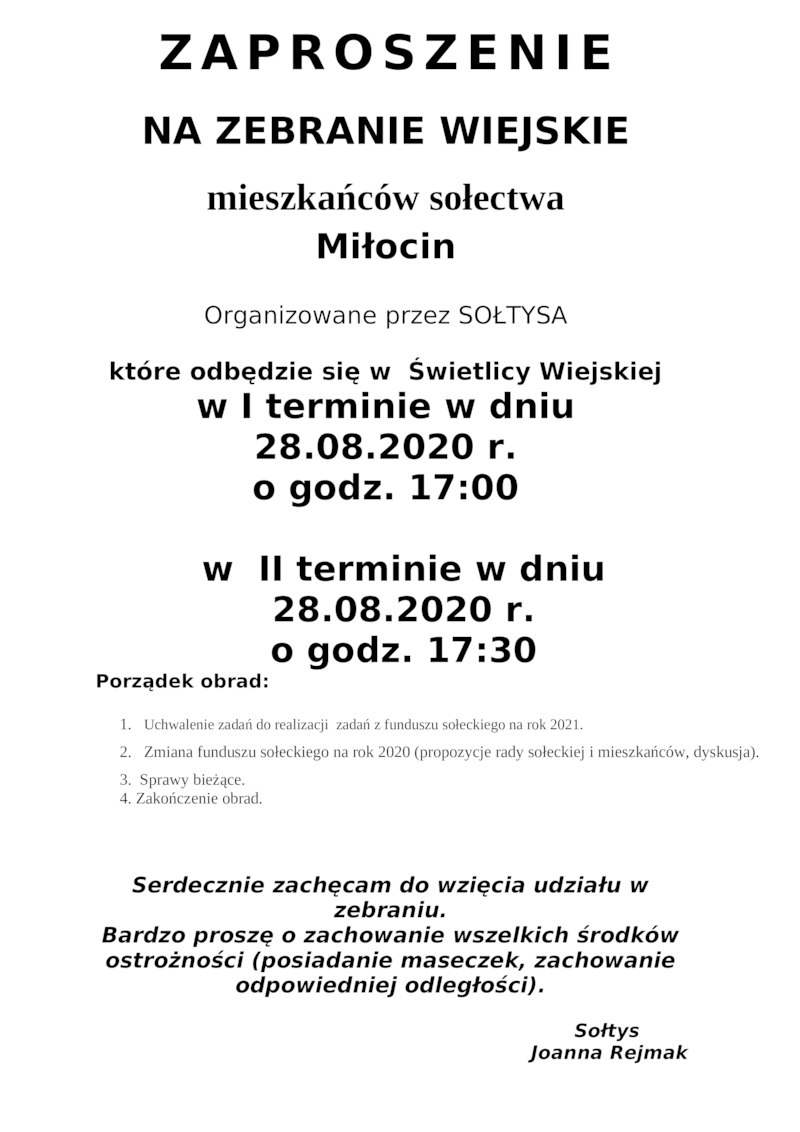 ZAPROSZENIE NA ZEBRANIE WIEJSKIE MIESZKAŃCÓW SOŁECTWA MIŁOCIN
