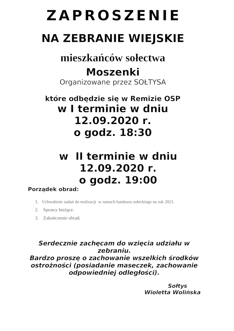 ZAPROSZENIE NA ZEBRANIE WIEJSKIE MIESZKAŃCÓW SOŁECTWA MOSZENKI