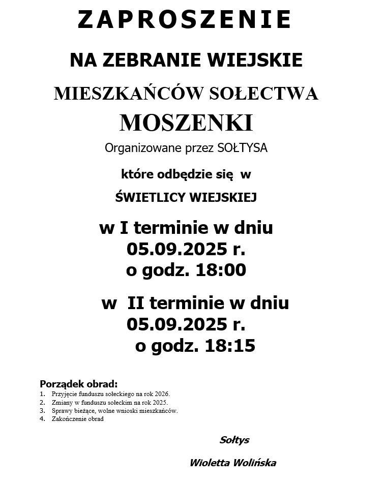 ZAPROSZENIE NA ZEBRANIE WIEJSKIE MIESZKAŃCÓW SOŁECTWA MOSZENKI ORGANIZOWANE PRZEZ SOŁTYSA