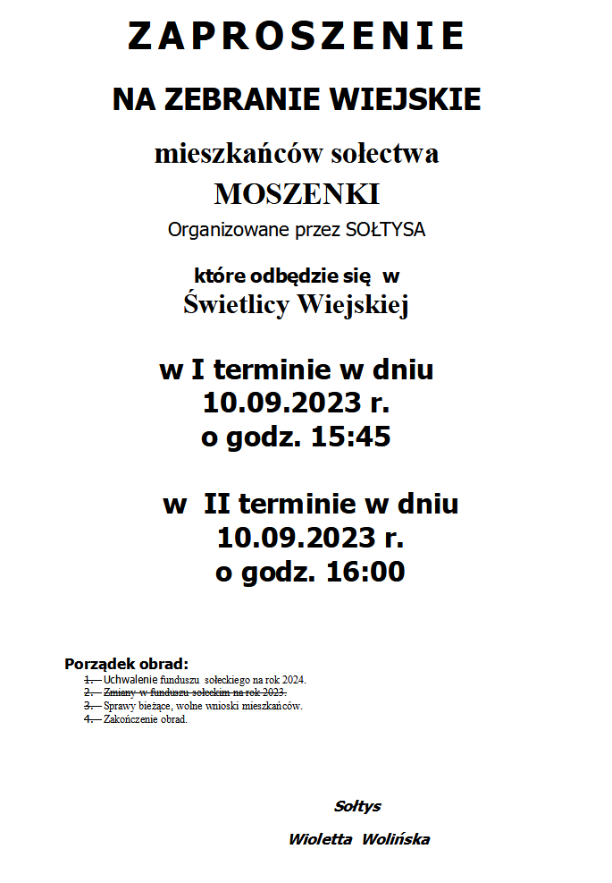 ZAPROSZENIE NA ZEBRANIE WIEJSKIE MIESZKAŃCÓW SOŁECTWA MOSZENKI ORGANIZOWANE PRZEZ SOŁTYSA