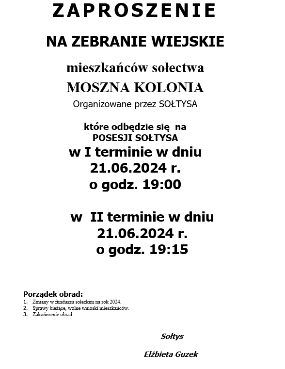 ZAPROSZENIE NA ZEBRANIE WIEJSKIE MIESZKAŃCÓW SOŁECTWA MOSZNA KOLONIA