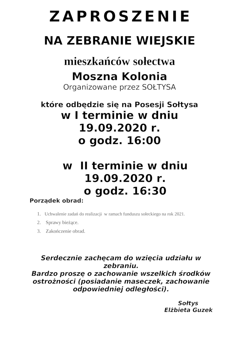 ZAPROSZENIE NA ZEBRANIE WIEJSKIE MIESZKAŃCÓW SOŁECTWA MOSZNA KOLONIA