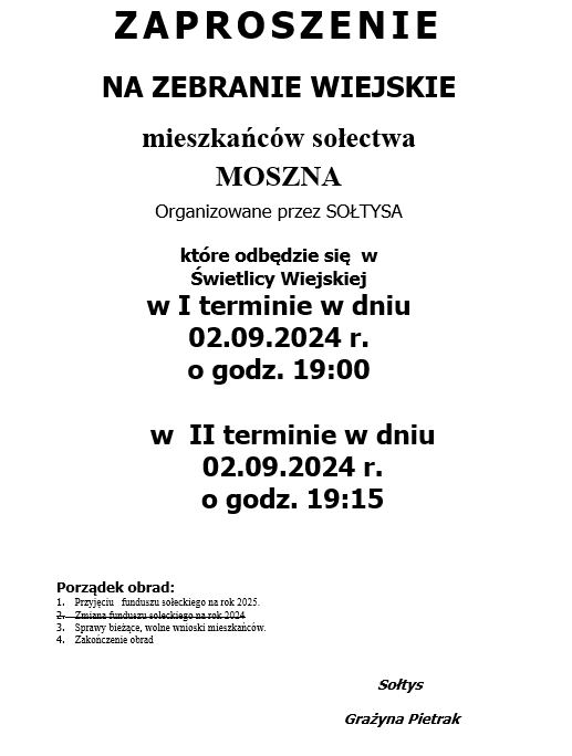 ZAPROSZENIE NA ZEBRANIE WIEJSKIE MIESZKAŃCÓW SOŁECTWA MOSZNA ORGANIZOWANE PRZEZ SOŁTYSA
