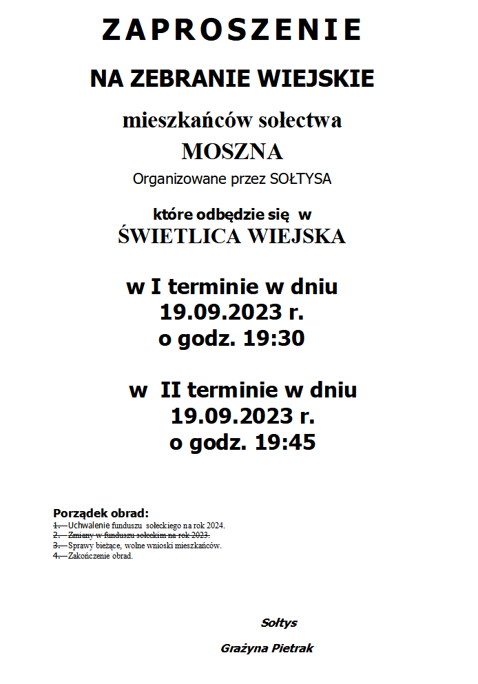 ZAPROSZENIE NA ZEBRANIE WIEJSKIE MIESZKAŃCÓW SOŁECTWA MOSZNA ORGANIZOWANE PRZEZ SOŁTYSA