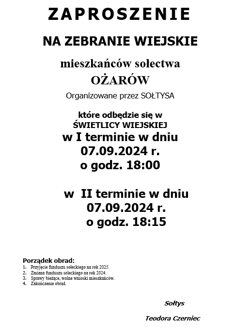ZAPROSZENIE NA ZEBRANIE WIEJSKIE MIESZKAŃCÓW SOŁECTWA OŻARÓW