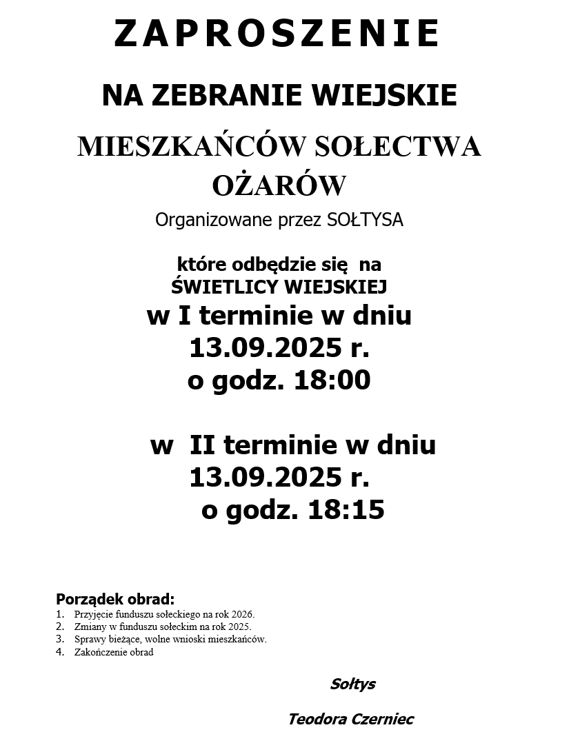 ZAPROSZENIE NA ZEBRANIE WIEJSKIE MIESZKAŃCÓW SOŁECTWA OŻARÓW ORGANIZOWANE PRZEZ SOŁTYSA