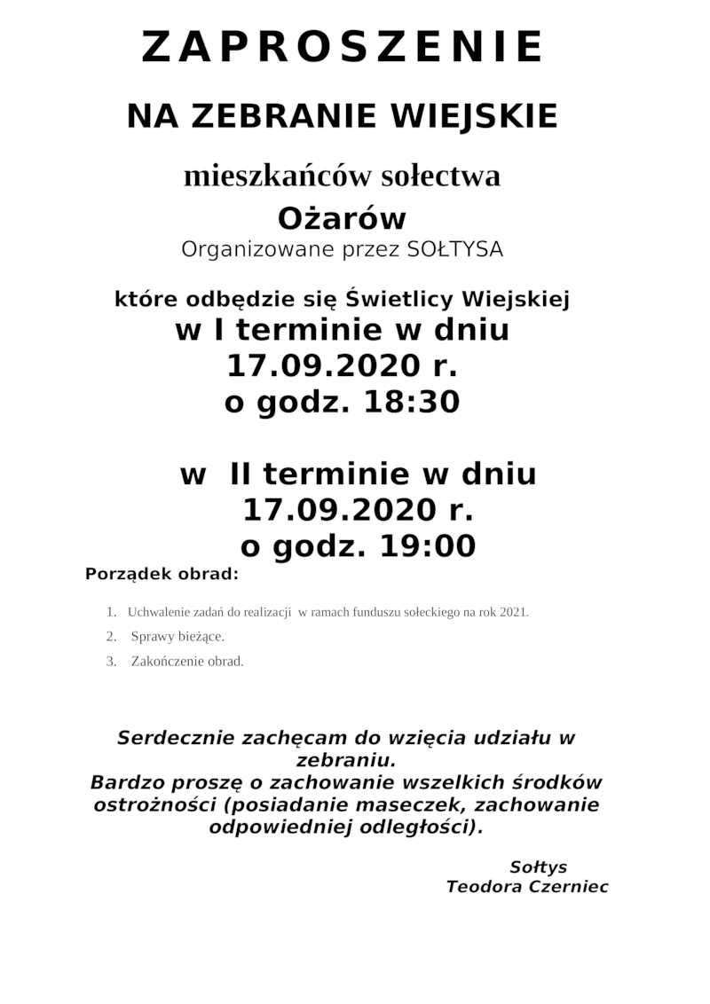 ZAPROSZENIE NA ZEBRANIE WIEJSKIE MIESZKAŃCÓW SOŁECTWA OŻARÓW