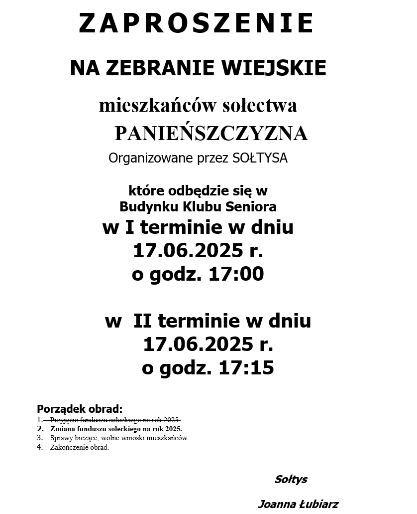 ZAPROSZENIE NA ZEBRANIE WIEJSKIE MIESZKAŃCÓW SOŁECTWA PANIEŃSZCZYZNA