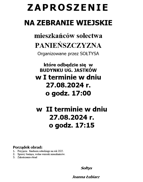 ZAPROSZENIE NA ZEBRANIE WIEJSKIE MIESZKAŃCÓW SOŁECTWA PANIEŃSZCZYZNA ORGANIZOWANE PRZEZ SOŁTYSA