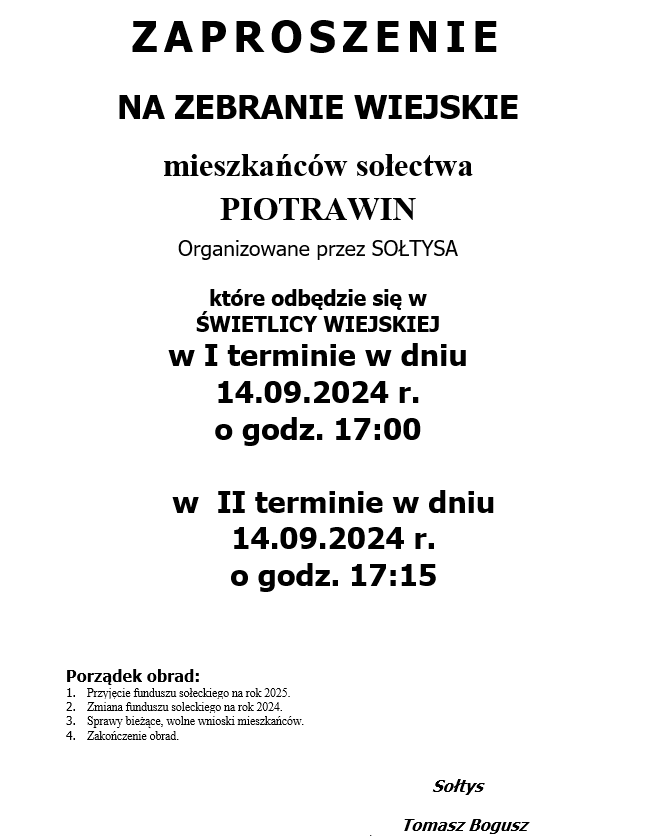 ZAPROSZENIE NA ZEBRANIE WIEJSKIE MIESZKAŃCÓW SOŁECTWA PIOTRAWIN ORGANIZOWANE PRZEZ SOŁTYSA