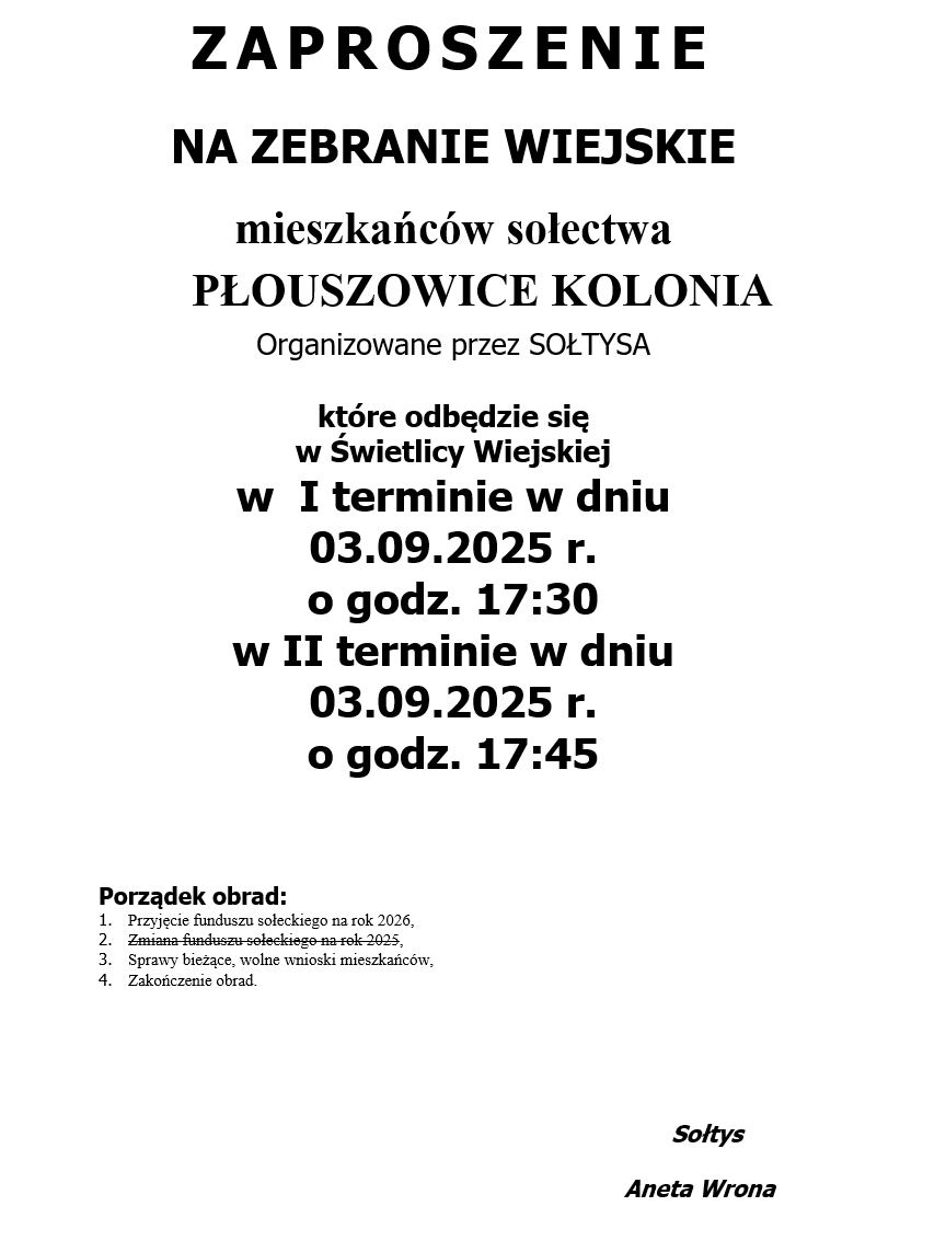 ZAPROSZENIE NA ZEBRANIE WIEJSKIE MIESZKAŃCÓW SOŁECTWA PŁOUSZOWICE KOLONIA ORGANIZOWANE PRZEZ SOŁTYSA