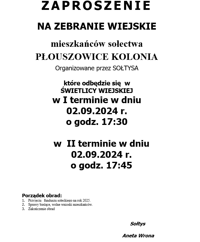 ZAPROSZENIE NA ZEBRANIE WIEJSKIE MIESZKAŃCÓW SOŁECTWA PŁOUSZOWICE KOLONIA ORGANIZOWANE PRZEZ SOŁTYSA