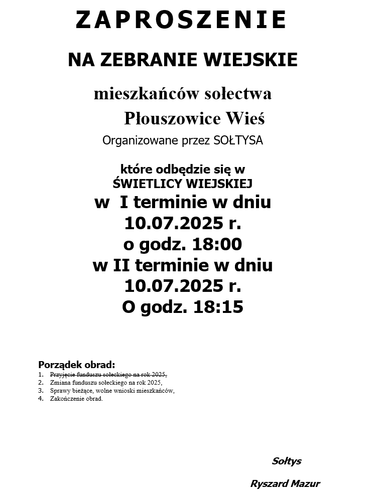 ZAPROSZENIE NA ZEBRANIE WIEJSKIE MIESZKAŃCÓW SOŁECTWA PŁOUSZOWICE WIEŚ