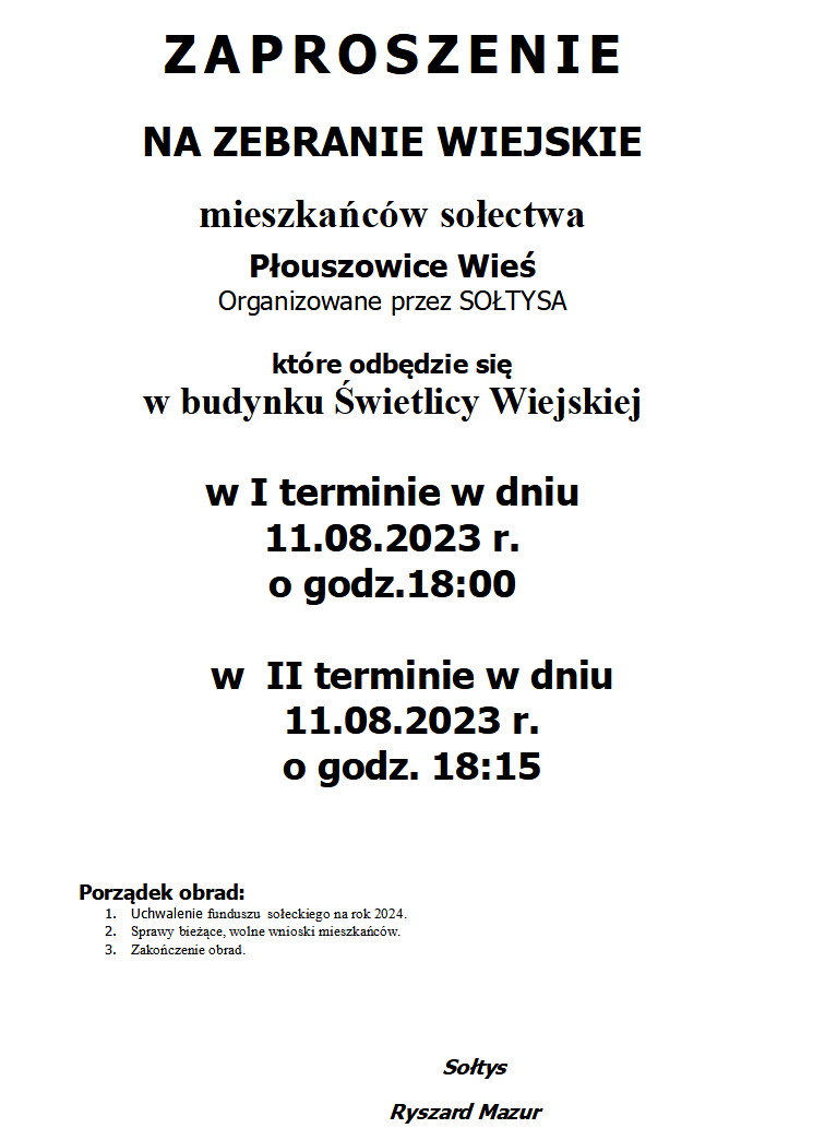 ZAPROSZENIE NA ZEBRANIE WIEJSKIE MIESZKAŃCÓW SOŁECTWA PŁOUSZOWICE WIEŚ ORGANIZOWANE PRZEZ SOŁTYSA