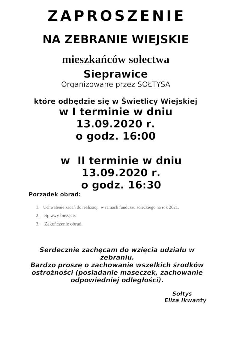ZAPROSZENIE NA ZEBRANIE WIEJSKIE MIESZKAŃCÓW SOŁECTWA SIEPRAWICE