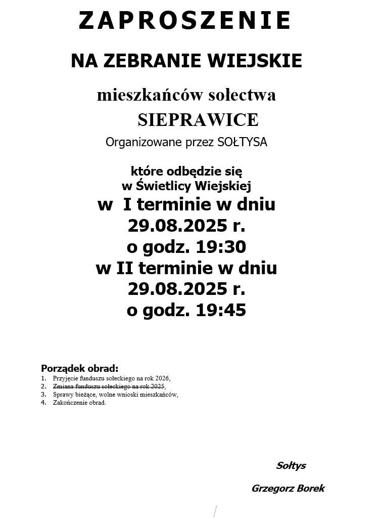 ZAPROSZENIE NA ZEBRANIE WIEJSKIE MIESZKAŃCÓW SOŁECTWA SIEPRAWICE ORGANIZOWANE PRZEZ SOŁTYSA