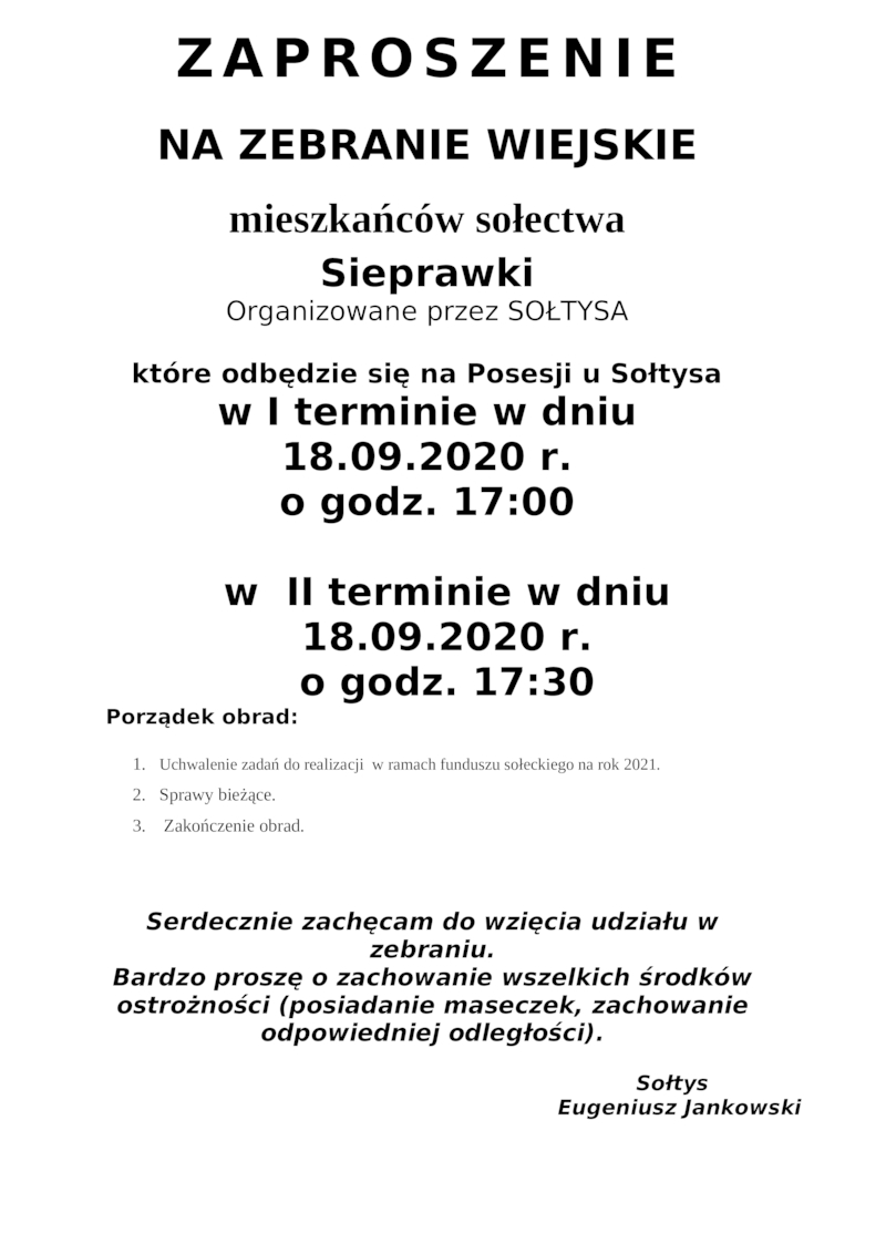 ZAPROSZENIE NA ZEBRANIE WIEJSKIE MIESZKAŃCÓW SOŁECTWA SIEPRAWKI