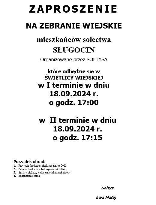 ZAPROSZENIE NA ZEBRANIE WIEJSKIE MIESZKAŃCÓW SOŁECTWA SŁUGOCIN