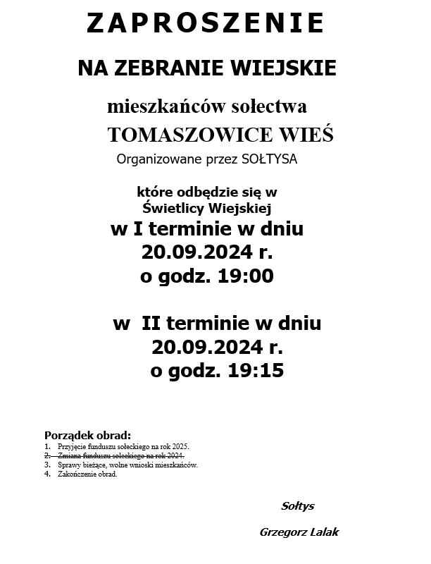 ZAPROSZENIE NA ZEBRANIE WIEJSKIE MIESZKAŃCÓW SOŁECTWA TOMASZOWICE WIEŚ