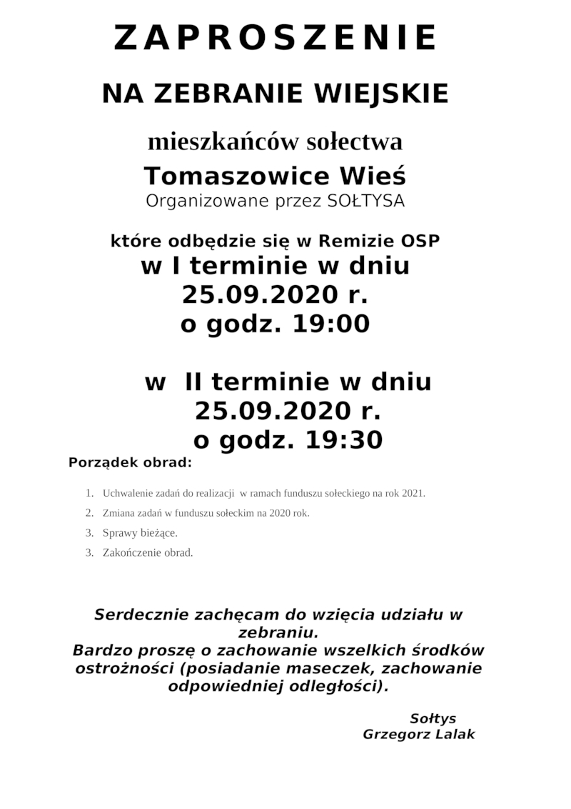 ZAPROSZENIE NA ZEBRANIE WIEJSKIE MIESZKAŃCÓW SOŁECTWA TOMASZOWICE WIEŚ