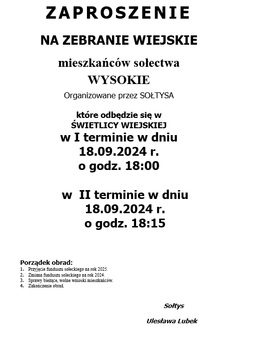 ZAPROSZENIE NA ZEBRANIE WIEJSKIE MIESZKAŃCÓW SOŁECTWA WYSOKIE