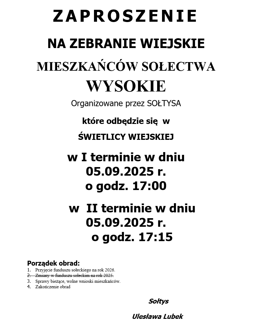ZAPROSZENIE NA ZEBRANIE WIEJSKIE MIESZKAŃCÓW SOŁECTWA WYSOKIE ORGANIZOWANE PRZEZ SOŁTYSA