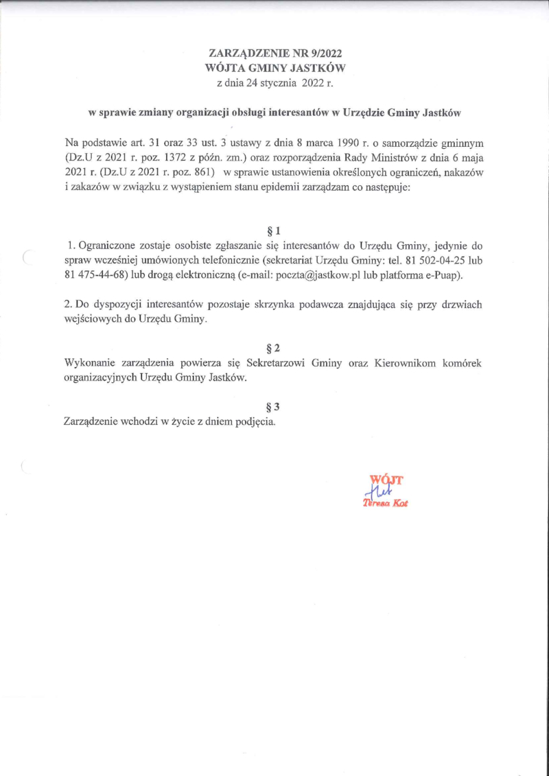 ZARZĄDZENIE NR 9/2022 WÓJTA GMINY JASTKÓW Z DNIA 24 STYCZNIA 2022 R.