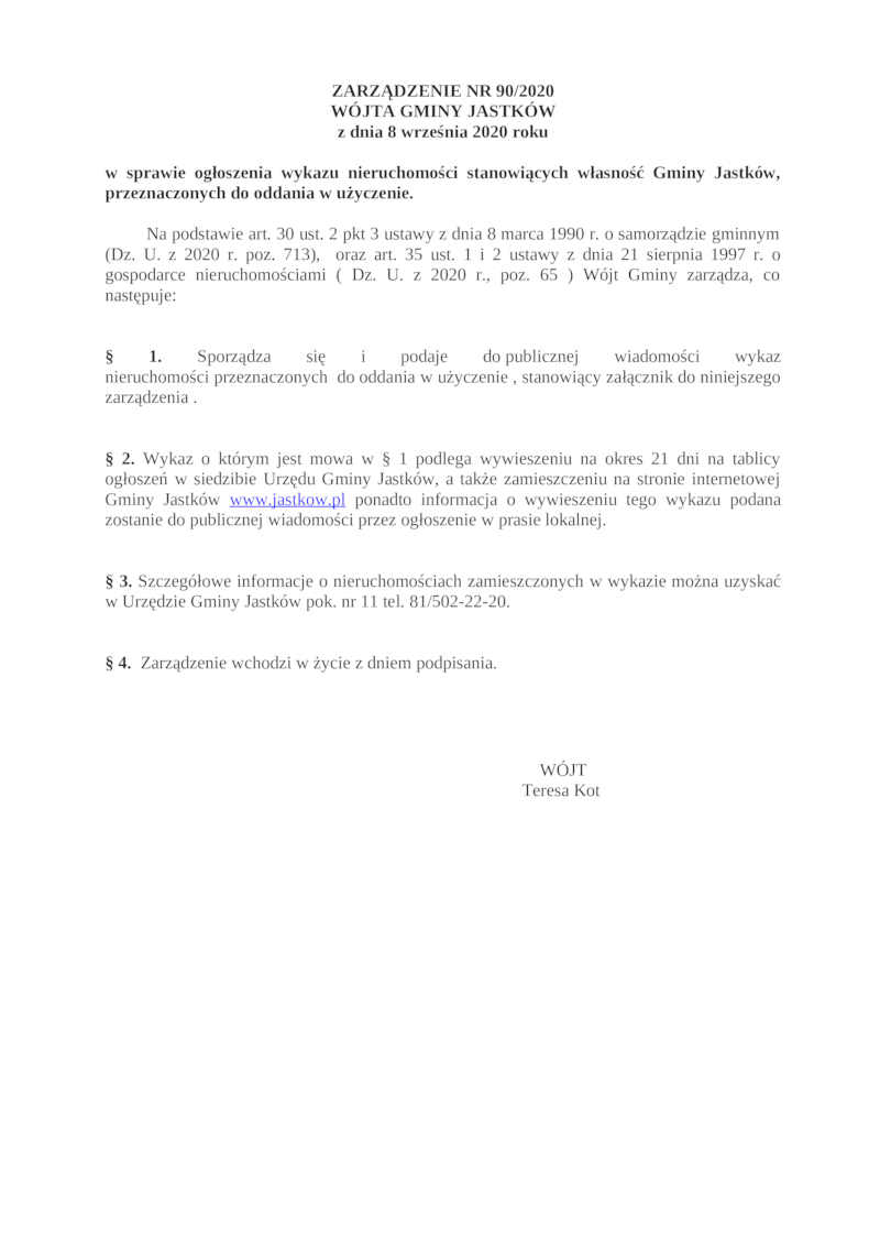 ZARZĄDZENIE NR 90/2020 WÓJTA GMINY JASTKÓW Z DNIA 8 WRZEŚNIA 2020 ROKU.