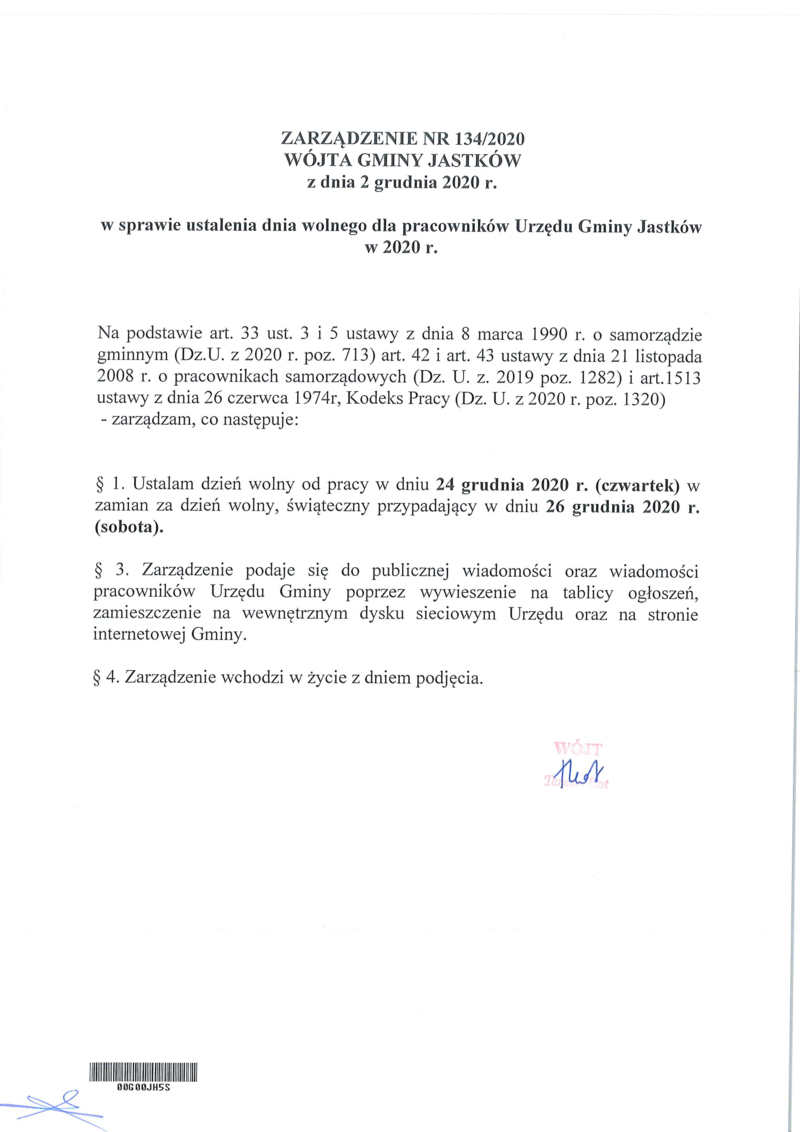 ZARZĄDZENIE WÓJTA GMINY JASTKÓW Z DNIA 02.12.2020 R.
