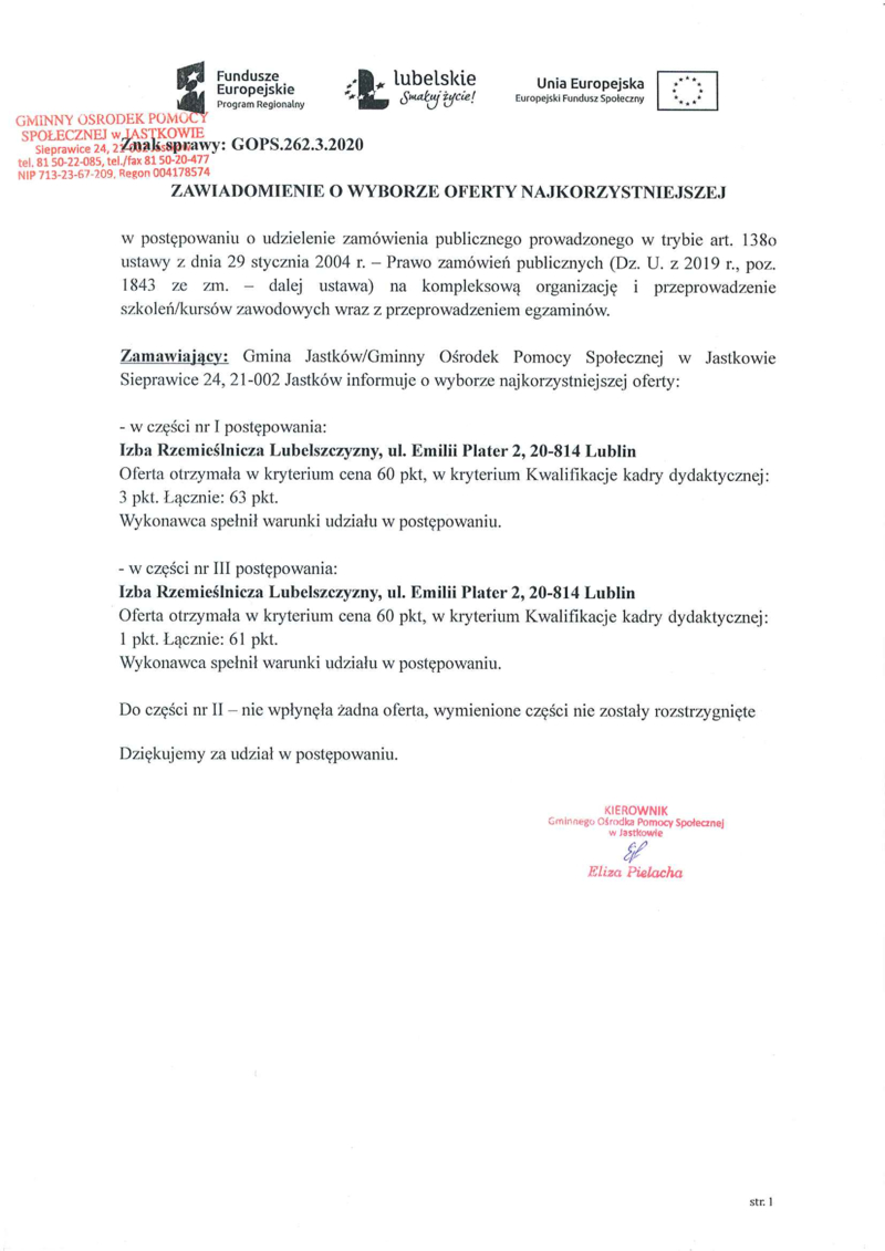 ZAWIADOMIENIE O WYBORZE OFERTY GOPS.262.3.2020