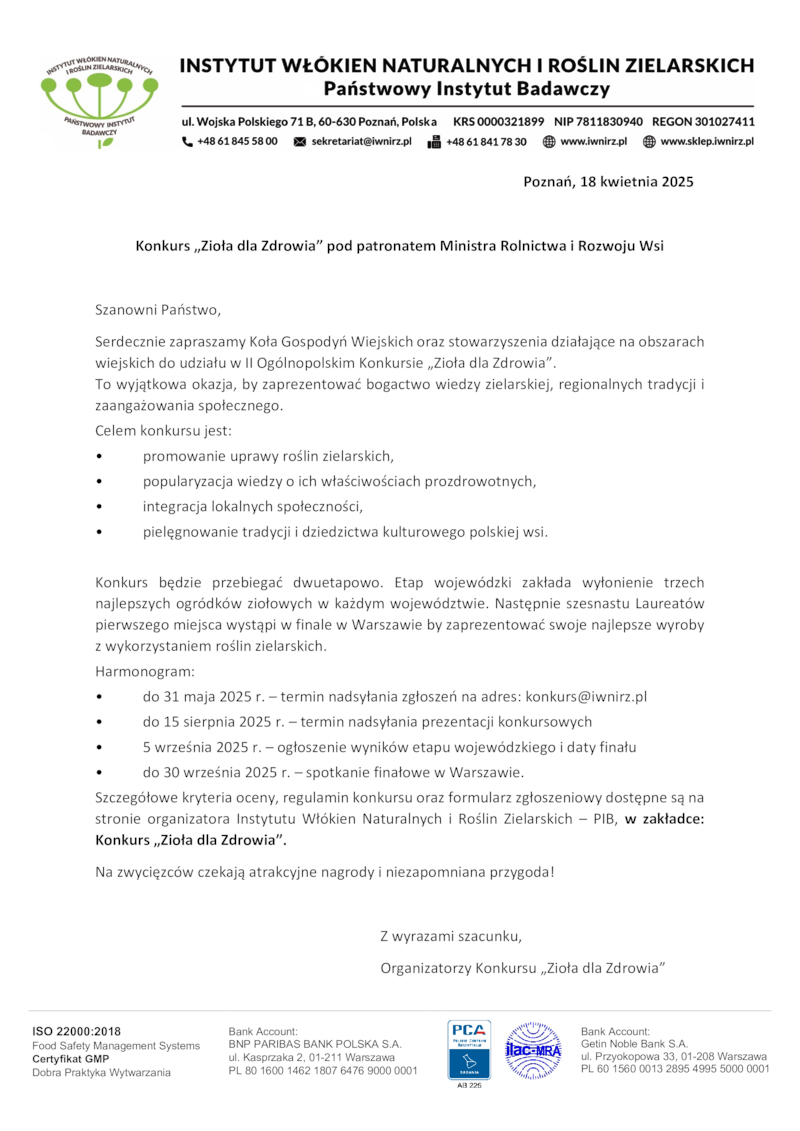Instytut Włókien Naturalnych i Roślin Zielarskich -PIB w Poznaniu jest organizatorem II Edycji Konkursu Zioła dla Zdrowia. Konkurs jest skierowany do Kół Gospodyń Wiejskich oraz innych Pozarządowych Organizacji Lokalnych. Jest to konkurs na założony i zaprezentowany w konkursie najciekawszy ogródek ziołowy.