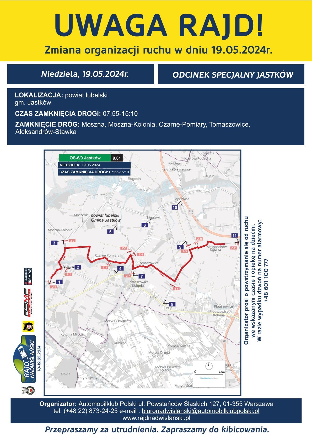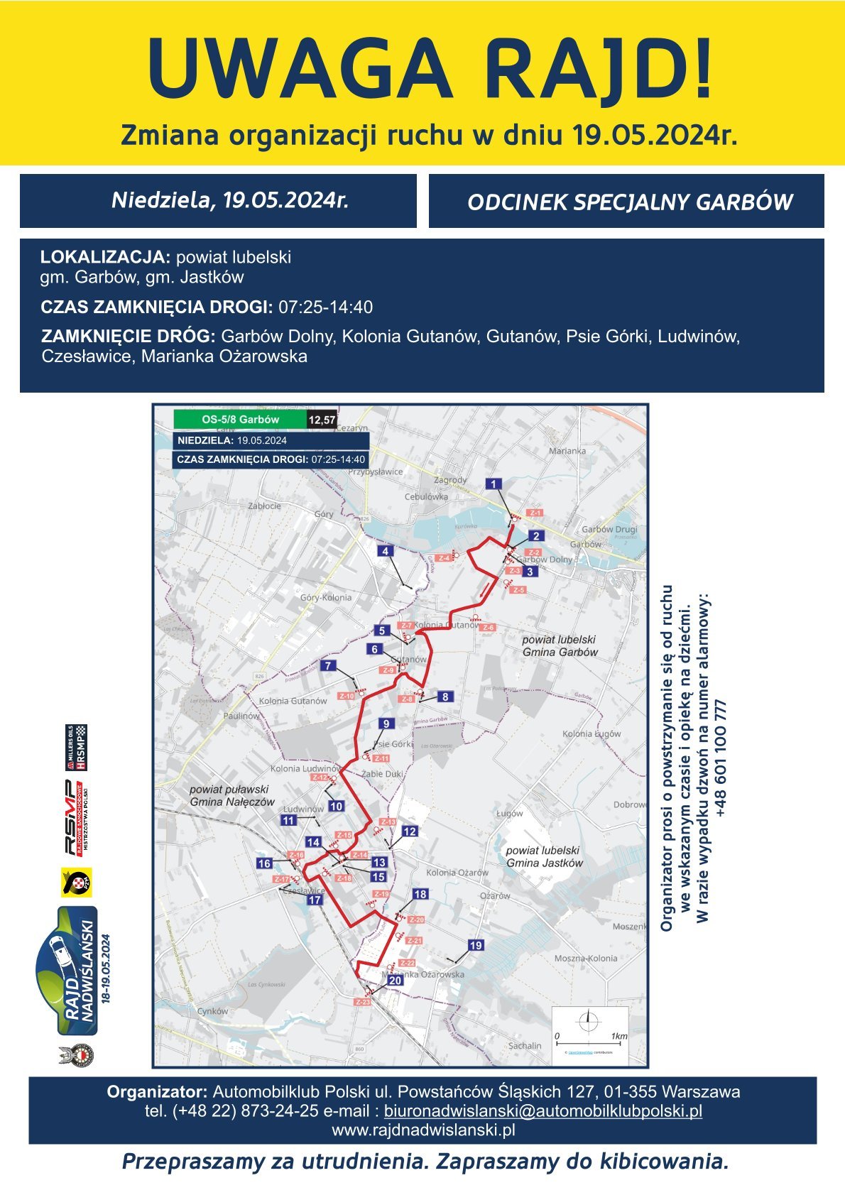 Prosimy o zachowanie szczególnej ostrożności oraz przestrzeganie tymczasowego oznakowania dróg. W przypadku uzasadnionych sytuacji organizator będzie wyrażał zgodę na przejazd.