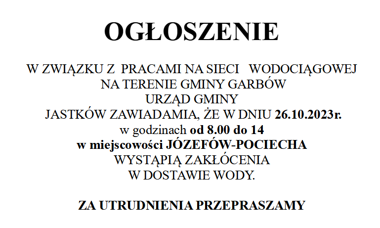 ZWIĄZKU Z PRACAMI NA SIECI WODOCIĄGOWEJ NA TERENIE GMINY GARBÓW URZĄD GMINY JASTKÓW ZAWIADAMIA, ŻE W DNIU 26.10.2023R. W GODZINACH OD 8.00 DO 14 W MIEJSCOWOŚCI JÓZEFÓW-POCIECHA WYSTĄPIĄ ZAKŁÓCENIA W DOSTAWIE WODY.