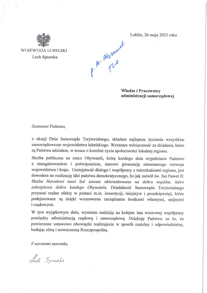 ŻYCZENIA OD WOJEWODY LUBELSKIEGO LECHA SPRAWKI Z OKAZJI DNIA SAMORZADU TERYTORIALNEGO.